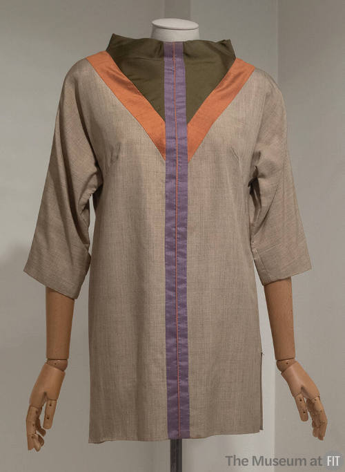 DescriptionTunic in heather silk and wool; wide funnel neckline from olive green silk faille pointed back and front yoke; yokes edged with 4 cm. band of orange / pink shantung; 4 cm. band of light purple shantung centered with orange / pink cording runs from neck to hem at center front and center back; 3/4 kimono sleeves; 16 cm. side vents; left side zipperExhibitions