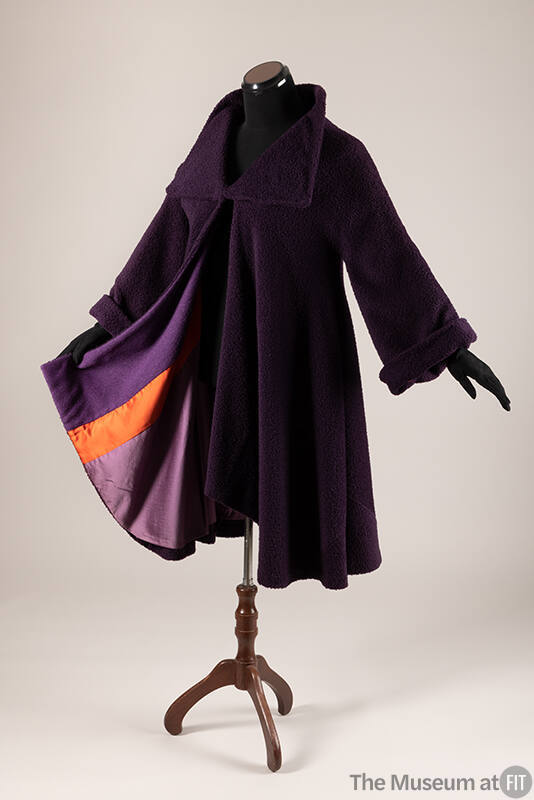 DescriptionCoat in purple textured wool; open neck with stand up band collar from V back yoke turns into wide square lapels rolling to bust line; flared kimono sleeves; flared body; angled fronts for tossing over shoulder; lined with purple geometric jacquard in intricate stripe arrangement; hook closing at base of collarExhibitions