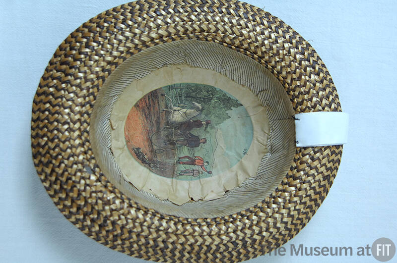 DescriptionWoman's natural straw plait hat with ribbon band; paper lining with illustration of men on Penny-Farthing bicycles and a woman riding a white horseCollections
