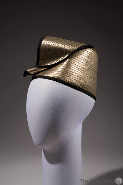 DescriptionGold lamé fez with black topstitching and grosgrain trim, flat crown extends to pointed LF tabCollections