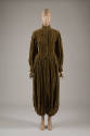 DescriptionCossack suit in green wide wale corduroy; fitted, cropped jacket with high stand collar and full, cuffed long sleeve; matching pantaloonsCollections