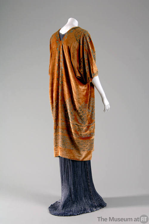 This evening coat (shown with 83.151.1) is printed with an ancient, Middle Eastern “Tree of Life” motif. The pattern became one of Fortuny’s perennial favorites and was printed on velvet, chiffon, and crepe over-garments. Fortuny often referenced ancient cultures in his work, creating garments that defied the changing trends of fashion.