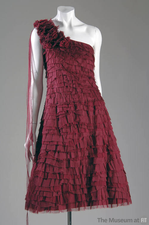 DescriptionShort one-shoulder evening dress in irregular pinked ruffles of red-violet organza and tulle, alternating and stitched to taffeta ground; shift dress with bell skirt, tulle underskirts; right shoulder strap trimmed on front with multiple self circles, with corsage effect, and long self streamers; piped neckline; LS zipperCollections