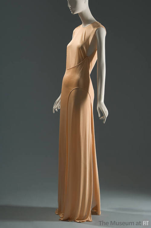 DescriptionLong sleeveless evening sheath in synthetic peach knit jersey with curved seam panel across front waist and down skirt front, and attached to back over-sheath with long oval keyhole opeaning at CB: round neckline; ankle lengthCollections