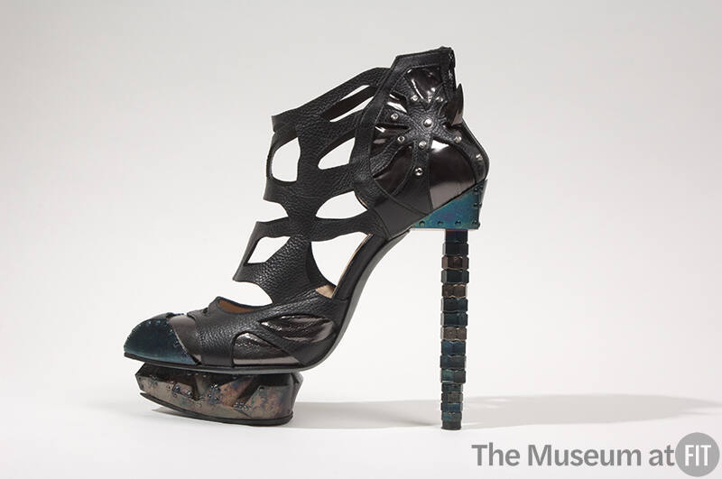 DescriptionBlack leather ankle sandal / boots with stacked bolt stiletto heels in blue and gold painted metal; front set-back bronze metallic platform faceted sole with small scattered rivets; front shoe and back heel under panel in metallic dark grey leather; textured leather cut-out instep panel to ankle and around heel with screw back studs at side back; blue metallic toe tips with rivets; metal horn at back left shoe; CB zipper opening