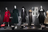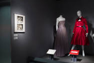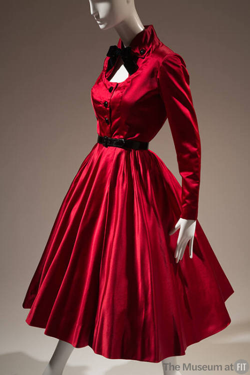 DescriptionCocktail dress and belt; red long sleeve dress in silk satin with fitted seamed waist and full mid calf length skirt; coordinating black patent leather narrow, shaped, structured belt with self covered buckleExhibitions
