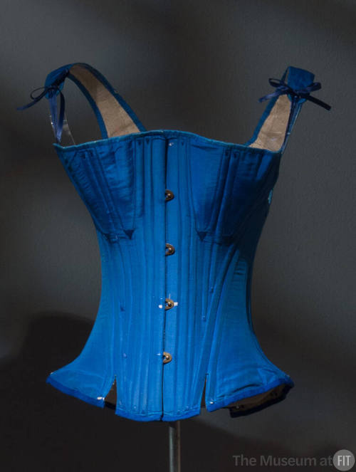 DescriptionPeacock blue stays / boned corset in silk, attached shoulder straps tie at front bodice with ribbon ties laced through brass eyelet grommets; brass busk at CF with four hooks at right side and four studded eyes at left side; straight front neckline with high rounded CF, U at back; shaped bust with two gore panels; fitted waist; shaped hip; high waist length, low rounded CF hem, split vents at front princess points; CB lace closure, 35 pairs (70) brass metal eyelet grommets at CB; hand embroidered arrow head design at front and back in silk thread; lighter blue silk binding at neckline, armholes and shoulder straps, cotton binding at hem; natural linen lining; laces not original, binding at hem possibly not original; hem may have been cut and restyled at a later date