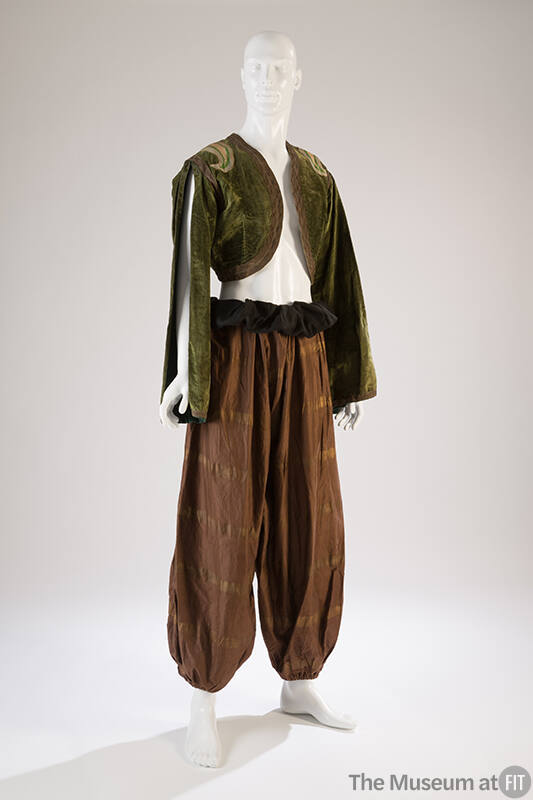 DescriptionMan's Orientalist style dance costume designed by Leon Bakst for Diaghilev's Ballets Russes Scheherazade; moss green bolero in silk velvet, slit at long sleeves and tarnished metallic braid trim; brown harem pants in polished cottonExhibitions