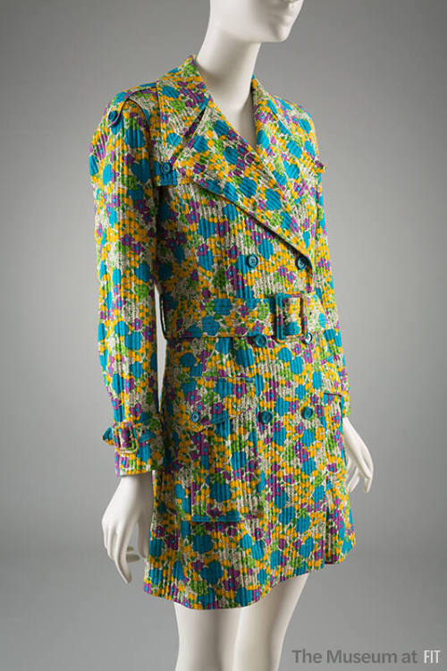 DescriptionSet: Multicolor floral print double breasted trench coat in ribbed cotton; 3/4 length; oversize lapels; turquoise blue / green buttons; flap patch pockets; CB kick pleat; cuff straps. Matching belt; covered buckle; rows of topstitching.
