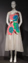 DescriptionWhite sheer silk organza sleeveless dress with multicolor floral appliques at bodice and upper skirt; coordinating pink bra and high waist pantiesCollections