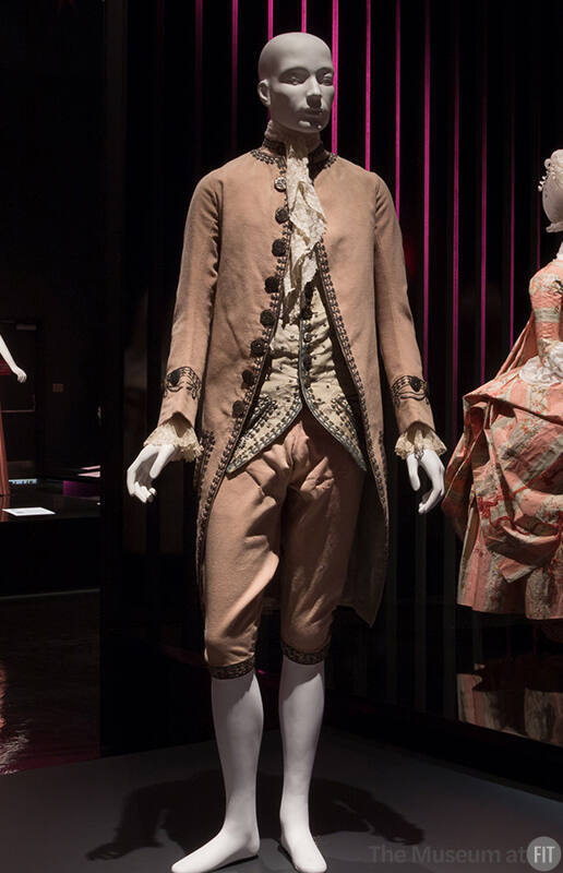 DescriptionMan's suit; pink felted wool jacket and breeches, pale green ribbed silk waistcoat, all with embroidered tassel scallops and ribbon swag designs in silver thread, iridescent sequins and beads, embroidered silver foil buttonsExhibitions