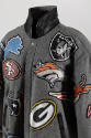 DescriptionJeff Hamilton x Reebok NFL varsity jacket with allover football team patches, long sleeve, snap front, black leather collar, cuffs and elasticized waistband, front slash pockets, red satin liningExhibitions