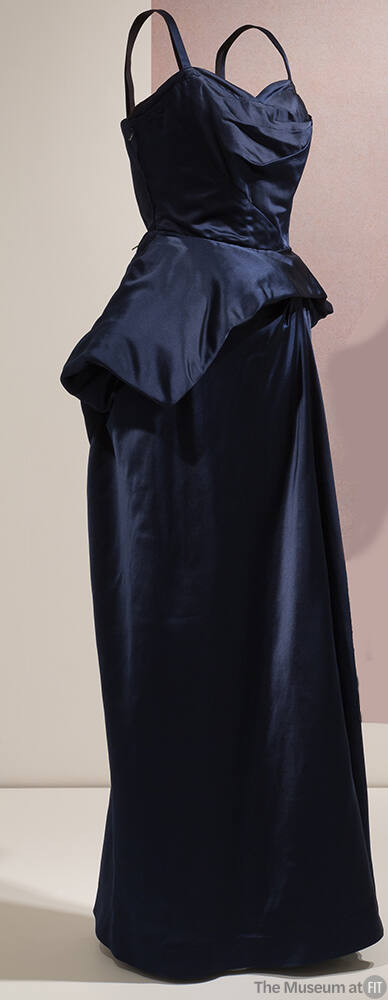 DescriptionNavy blue silk satin evening dress; strapless boned bodice diagonally seamed and draped; asymmetrical fold at hip over long tapered skirt draped at LF waist; fishtail hem effect; curved, diagonal RB zipper