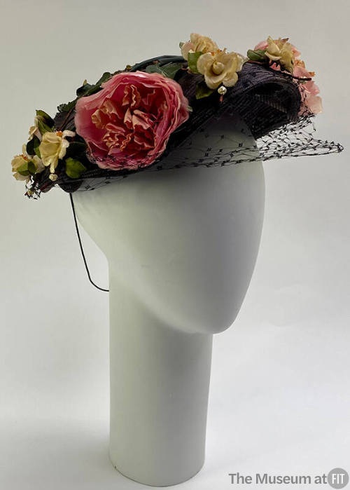 DescriptionBlack hat, pink and white fabric roses, and netCollections