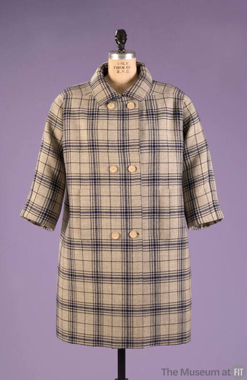DescriptionOne seam coat in light grey wool coating with overscaled navy blue plaid; engineered, draped and cut in single major piece, with all darts, seams and bound buttonholes coinciding with grid of plaid; double breasted cocoon coat with roll collar shaped with 18 darts invisibly placed between lines of plaid; vertical slit pockets; couture