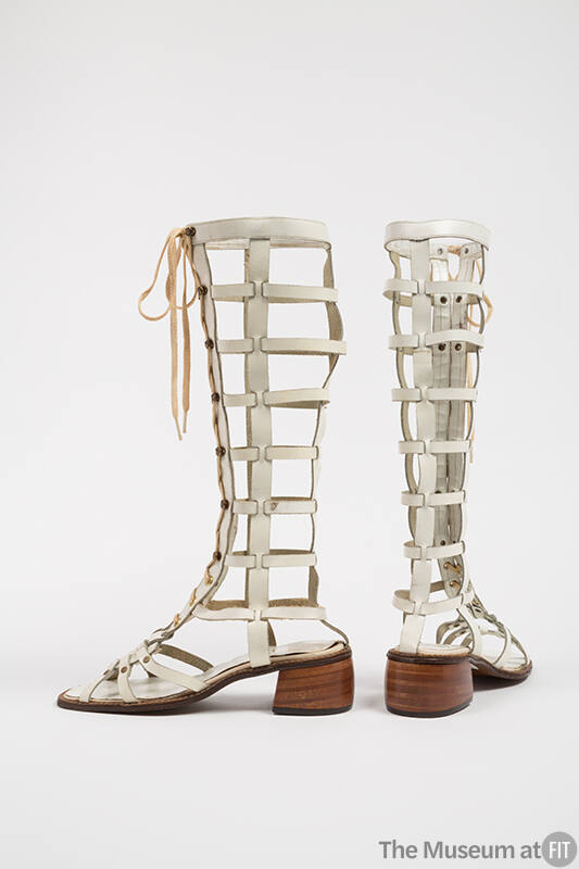 DescriptionKnee high boots or gladiator sandals, open construction made from strips of white leather, sandal style toe with leather strips linked to vamp ring and chunky, stacked heel, lace up center front closure over tongue.