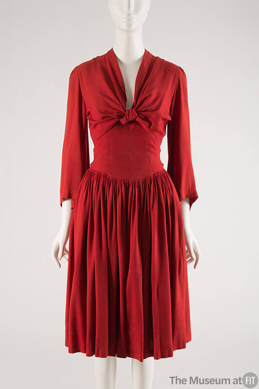 This dress was perfectly suited for the daily activities of a woman living in occupied Paris during World War II. Long sleeves provided warmth in an unheated home while the skirt’s front fullness allowed for easy mobility when riding a bike, the main mode of transportation. Fashionable touches include a halter neckline discreetly hidden under a knotted mock bolero.