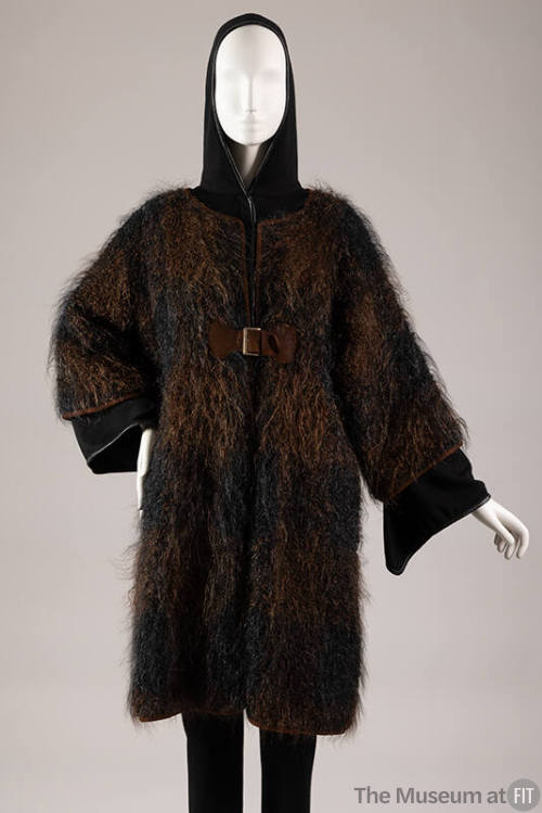 DescriptionBlack, brown mohair coat; straightline; round neck; long sleeve; black knit lining; brown suede trim.Exhibitions
