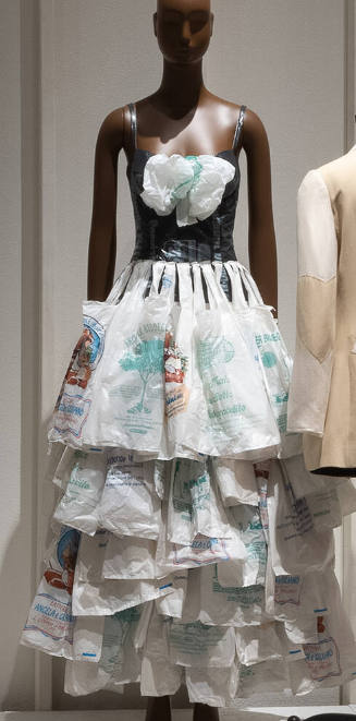 Franco Moschino (1950–1994) was as much a social commentator as he was a designer. “Fashion should be fun,” he once said, “and it should send a message.” Throughout the 1980s and into the early 1990s, he used humor and fashion as a platform to promote social awareness and to protest the materialism of the fashion industry: he once made his own version of a classic Chanel suit and in place of the familiar chain belt embroidered the words “This is a Waist of Money.” Moschino designed dresses printed with bar codes and made of garbage bags—he even designed a man’s shirt intended to resemble a straitjacket, with the slogan “For Fashion Victims Only” written on the back.